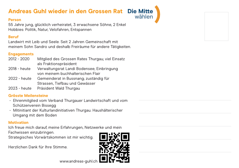 Bei den kommenden Kantonsratswahlen Thurgau vom 7. April 2024, kandidiere ich für einen Sitz im Grossen Rat.
