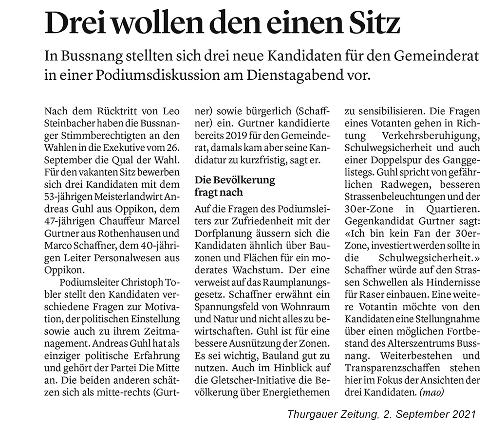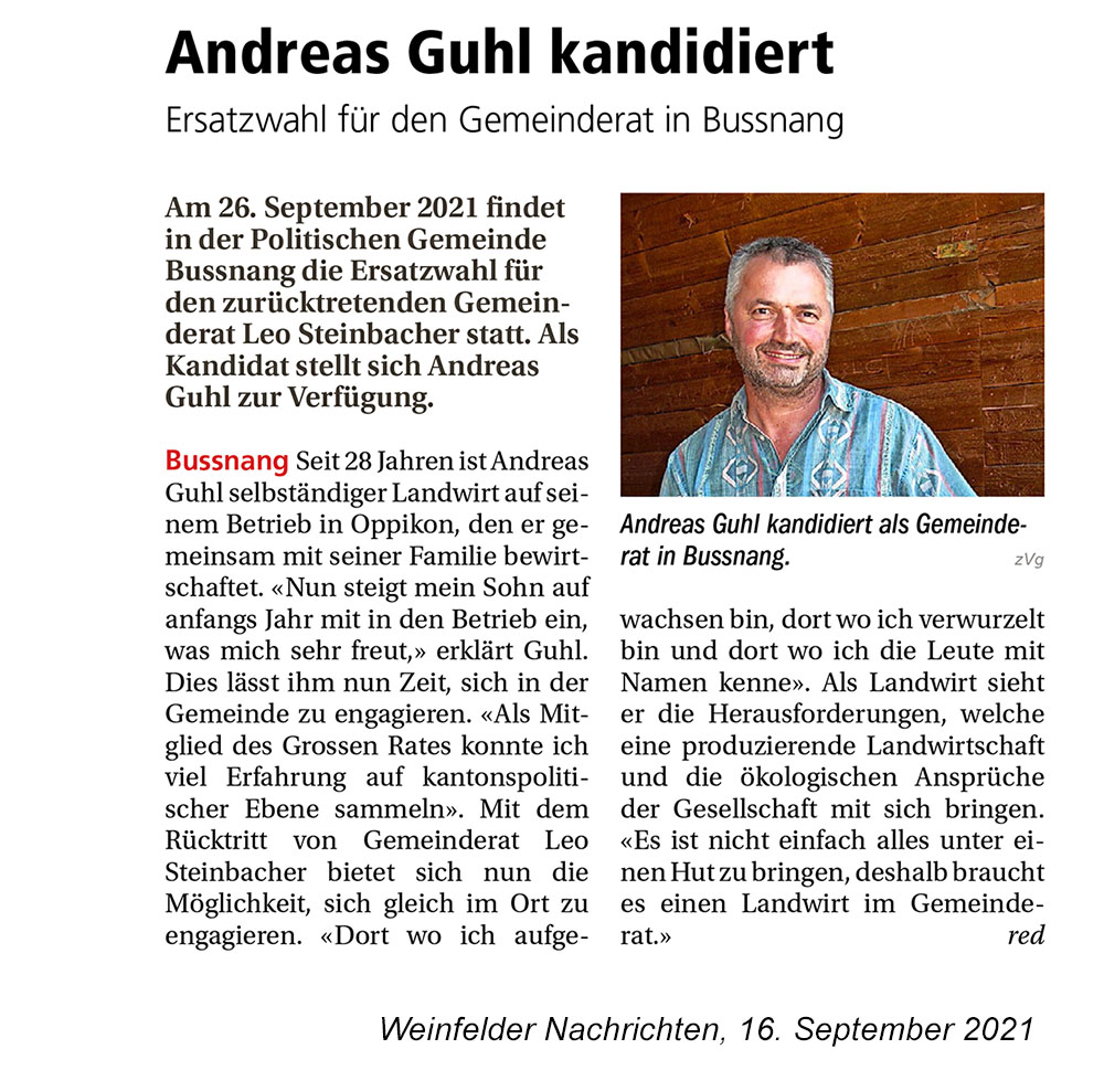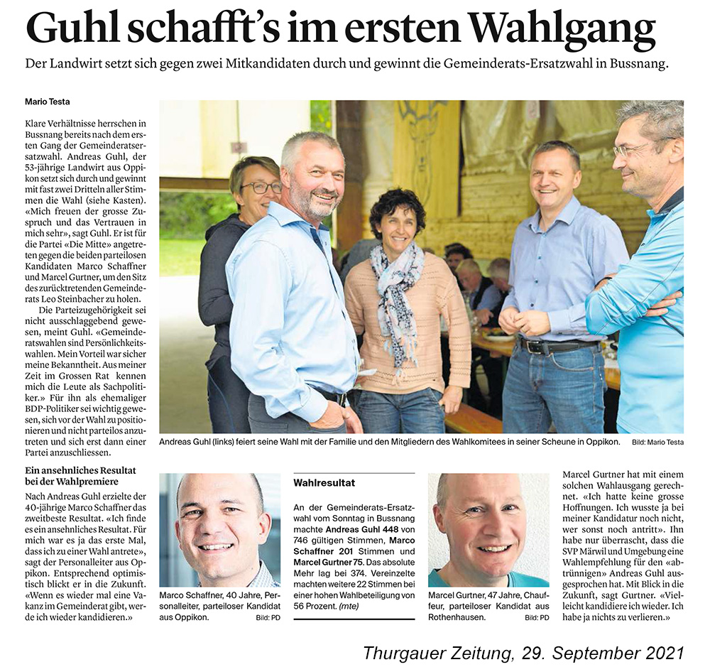 Am 26. September 2021 findet in der Politischen Gemeinde Bussnang die Ersatzwahl für den zurücktre-tenden Gemeinderat Leo Steinbacher statt. Als Kandidat stellt sich Andreas Guhl zur Verfügung. Der ehe-malige BDP-Politiker ist nun Mitglied der neuen Partei «Die Mitte». Zudem empfiehlt die SVP-Kreispartei Affeltrangen-Bussnang den Landwirten zur Wahl.